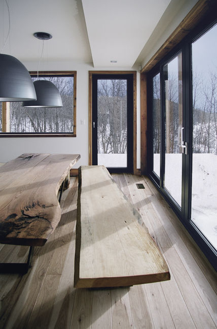 Nestled on the steep shore of Lake Massawippi like a gateway to the river, the house is located at the end of a driveable path through a wooded area. Designed as a wooden frame resting on a concrete base, the house gives way to the landscape in the background through a covered transverse gallery, a double-height lounge, and a triple-height lobby.