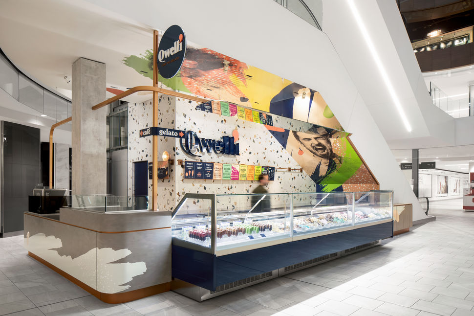 In 2021, the Quebec brand Paysanne Gelato is undergoing a makeover and becoming Qwelli, the art of Gelato. Humà has designed the brand's entire design language across eight concessions: the Qwelli at the Eaton Centre is part of this complete restructuring.